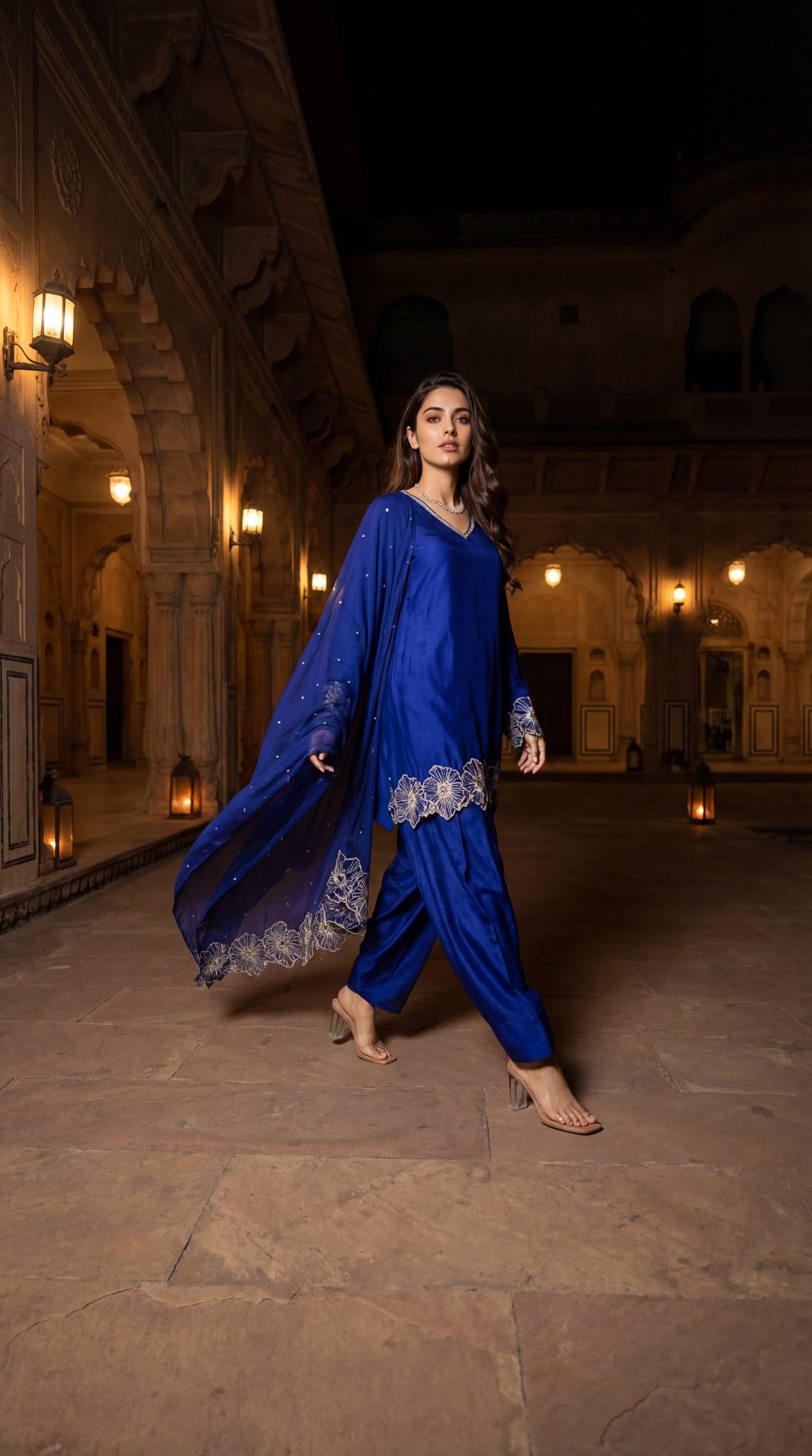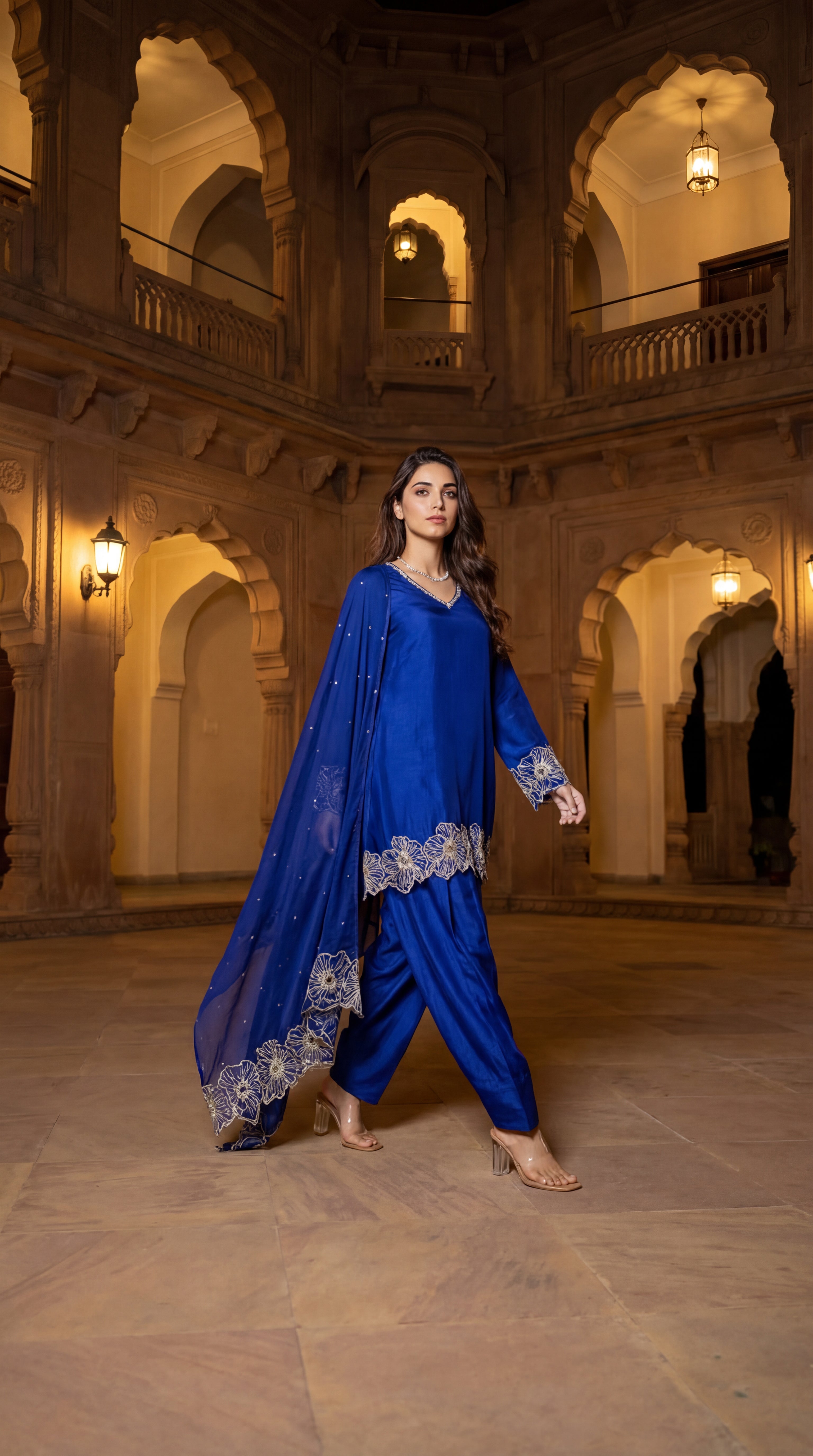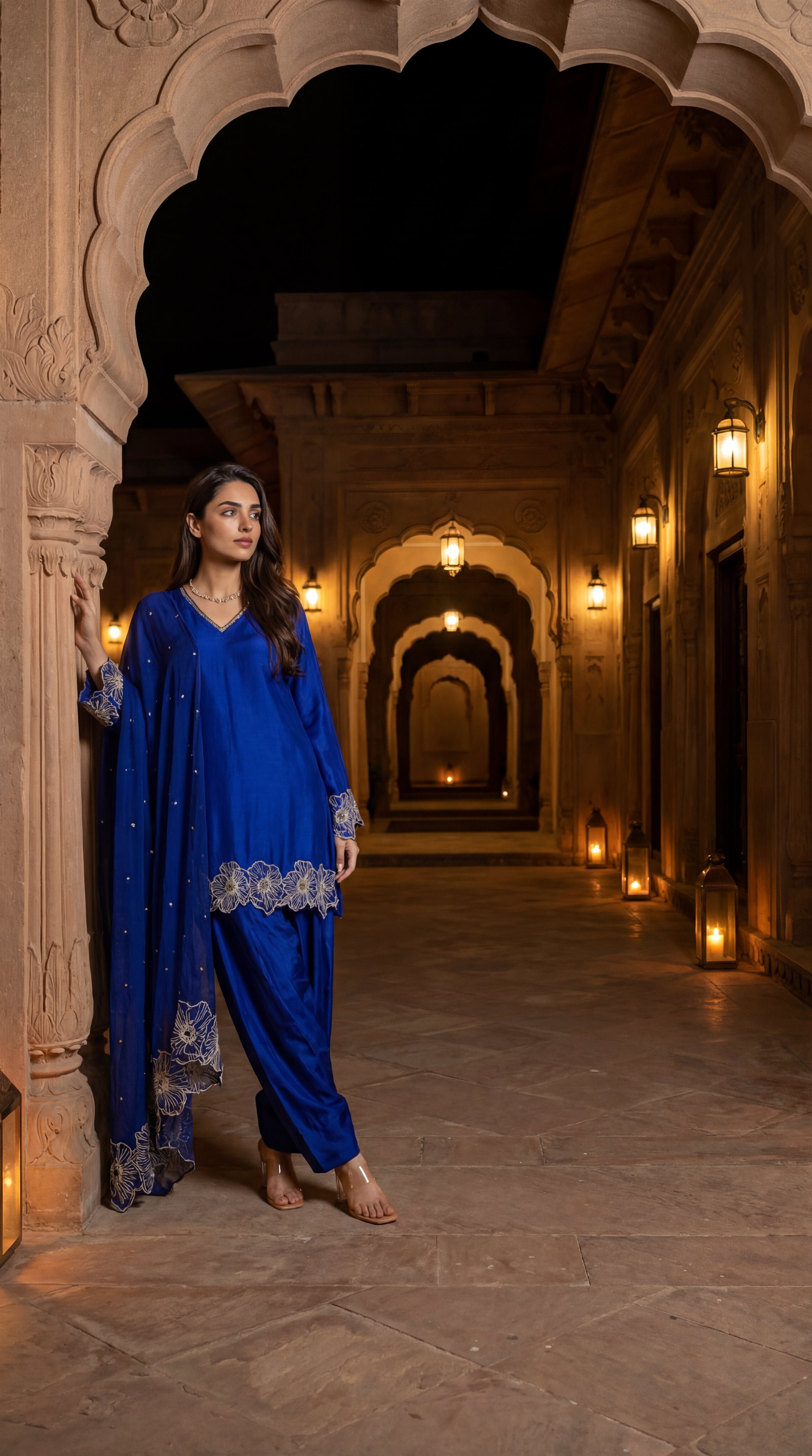 Elevate your festive wardrobe with this graceful Russian Silk Suit Set, crafted to reflect modern elegance with a touch of luxury. The kurti features rich Russian silk adorned with silver 3D floral embroidery, adding dimension and a subtle shimmer to the silhouette. Paired with sleek straight-fit pants, the ensemble offers a refined and flattering look. A pure organza dupatta completes the set, lending an airy, sophisticated finish—perfect for celebrations and special occasions.