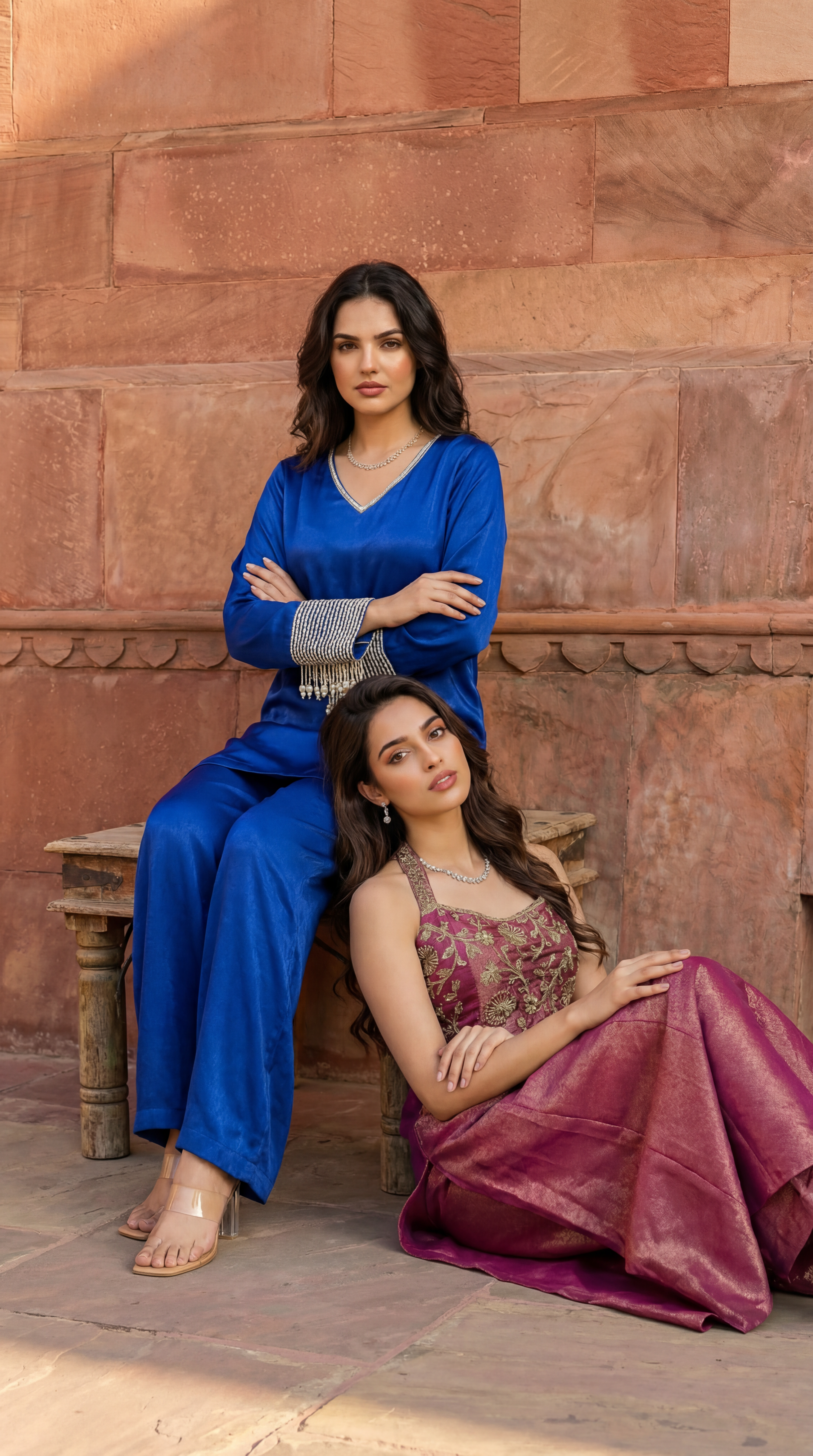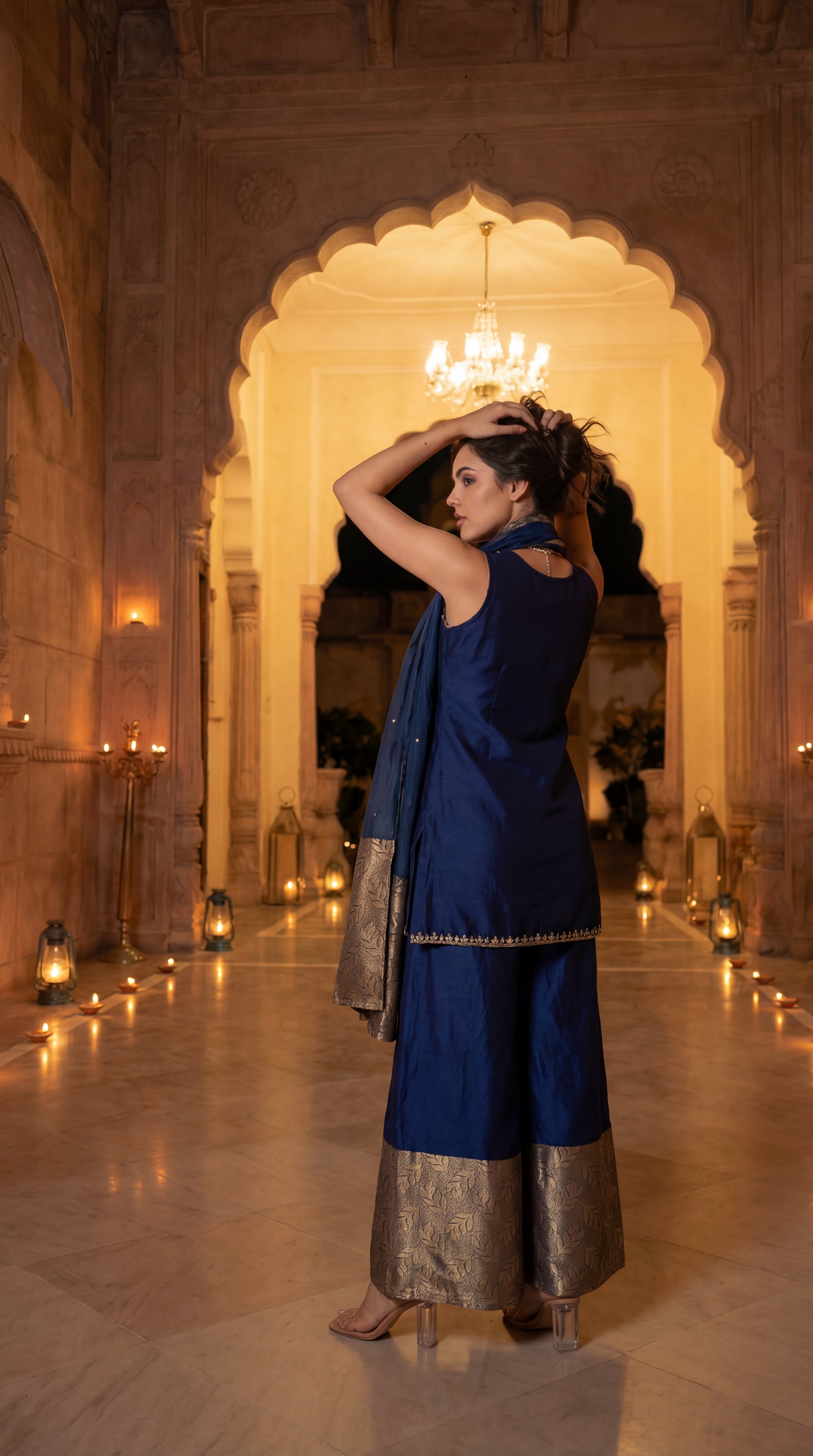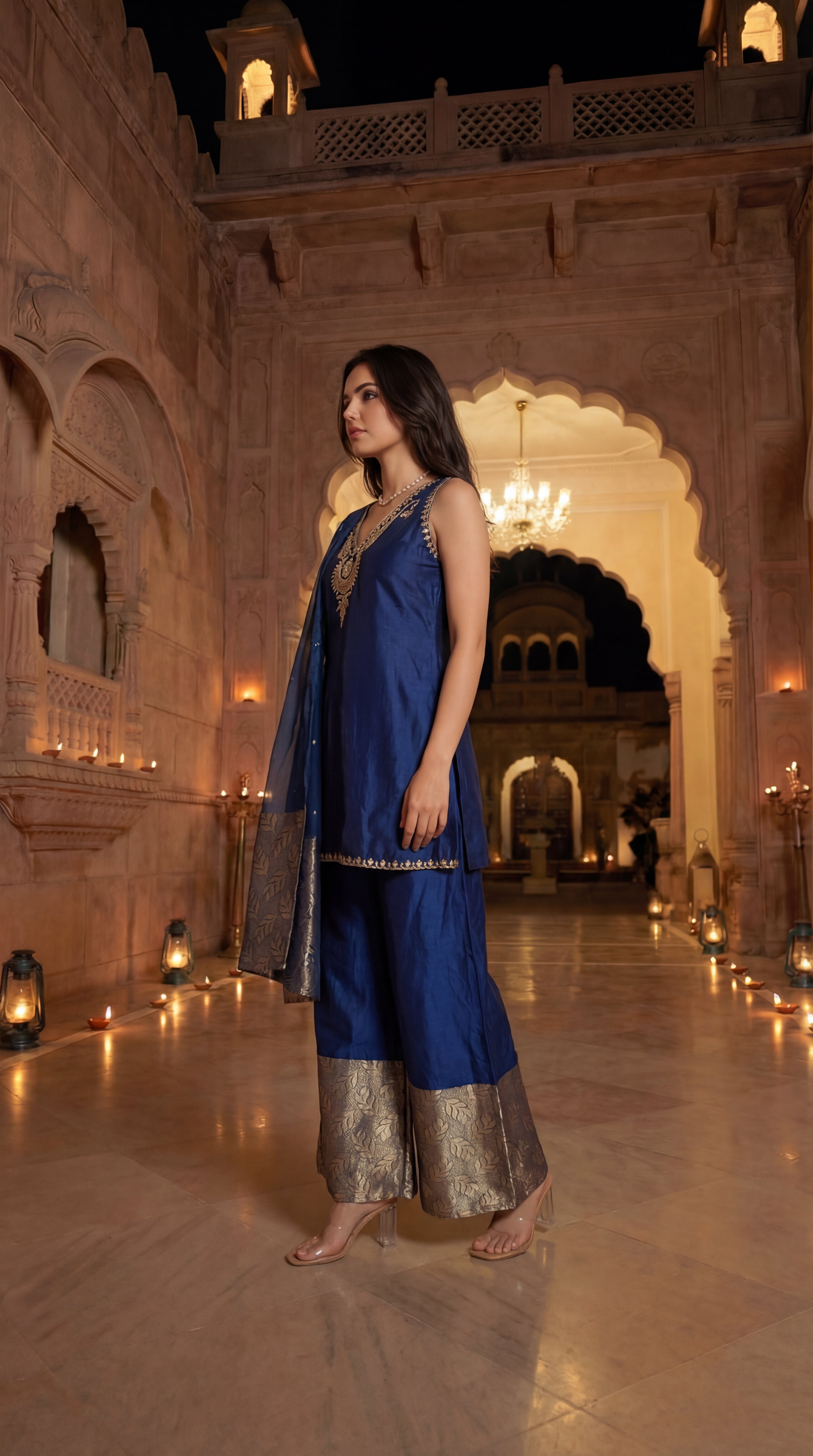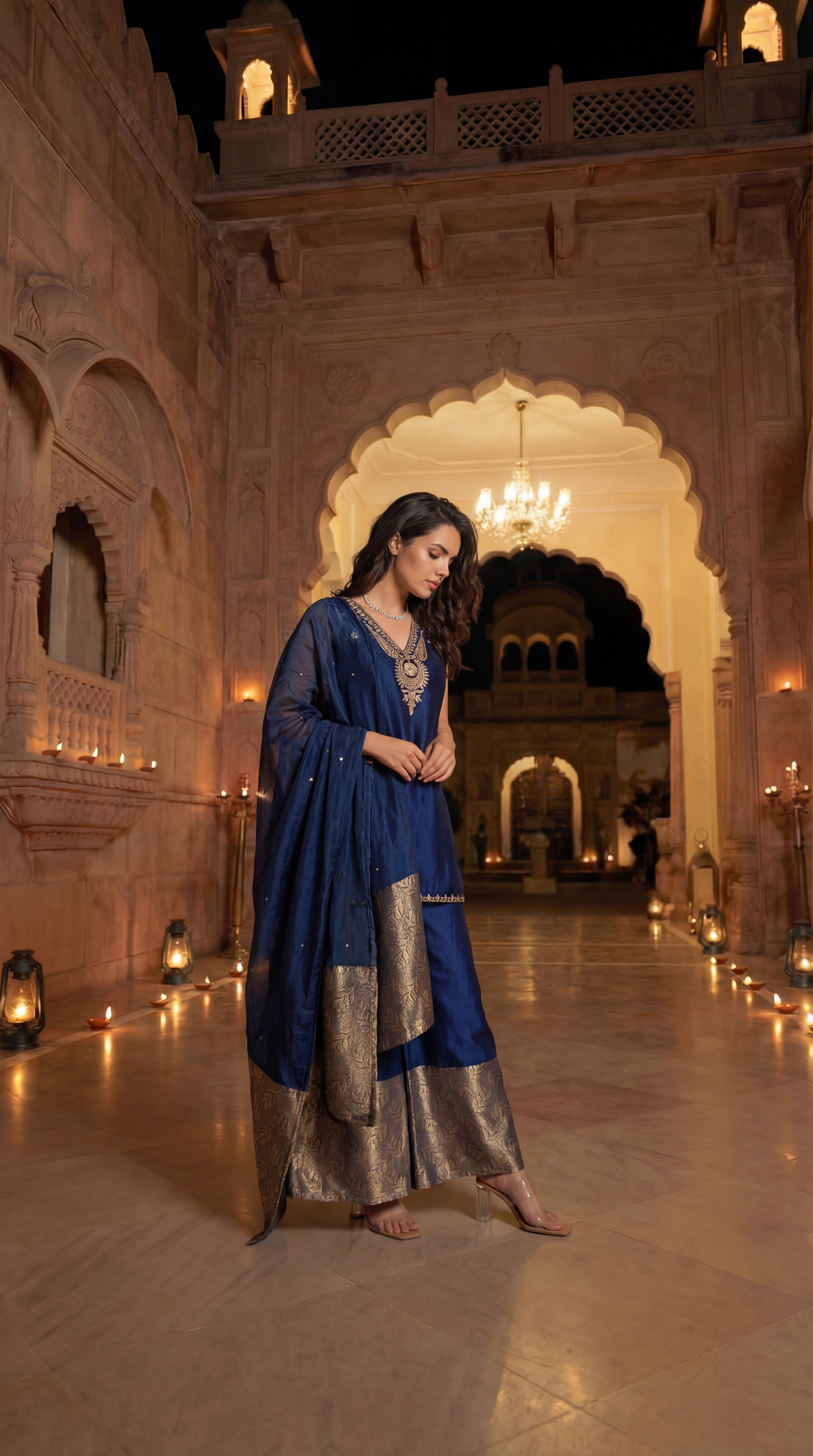 A luxurious three-piece ensemble crafted in rich Russian silk, designed to exude timeless elegance and festive grandeur. The kurta is highlighted with an exquisitely embroidered neckline enhanced with intricate handwork, adding depth and artisanal charm to the silhouette. The set is paired with refined pants featuring brocade detailing, lending a regal and structured appeal. Completing the look is a graceful organza dupatta enriched with brocade accents, perfectly balancing lightness with opulence—ideal for festive occasions and grand celebrations.