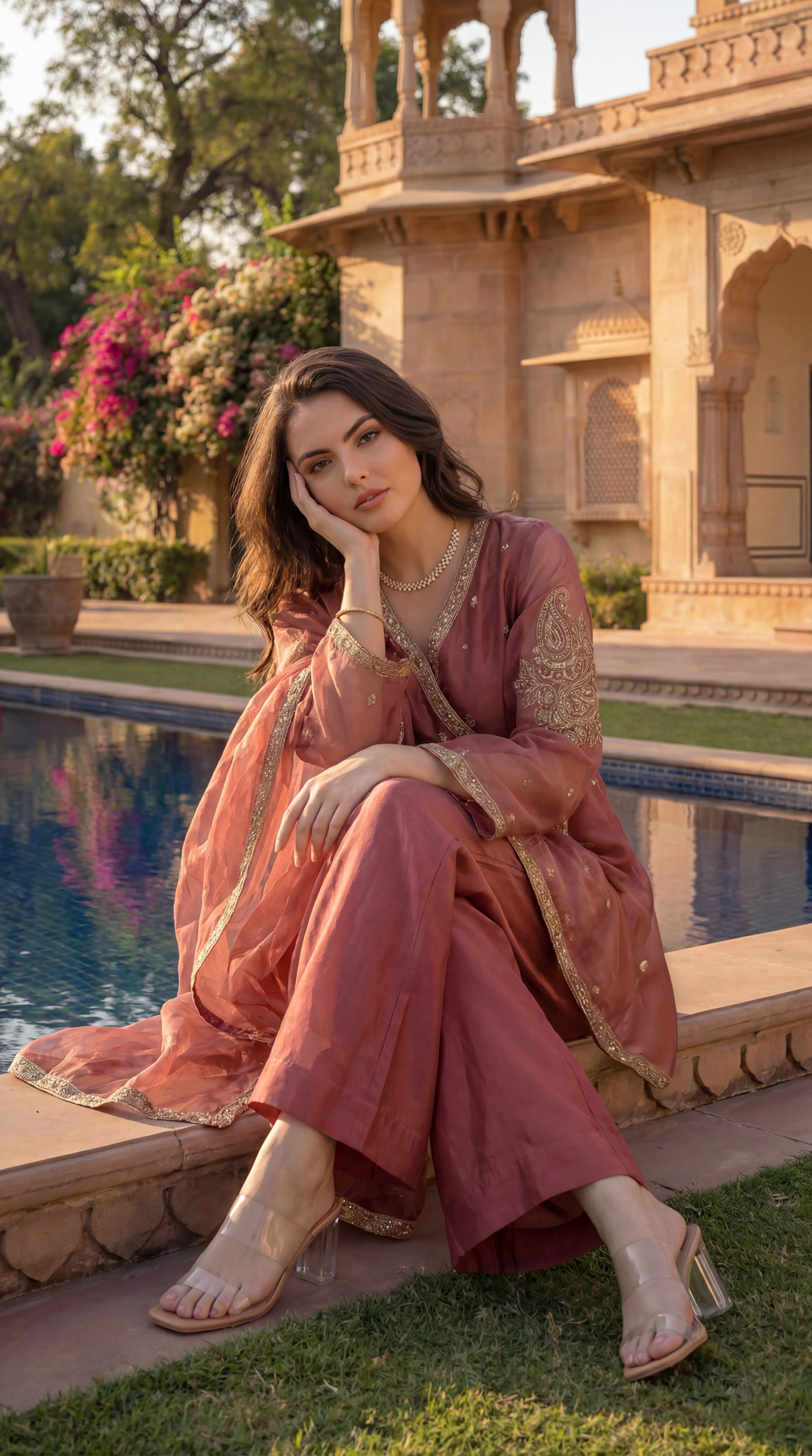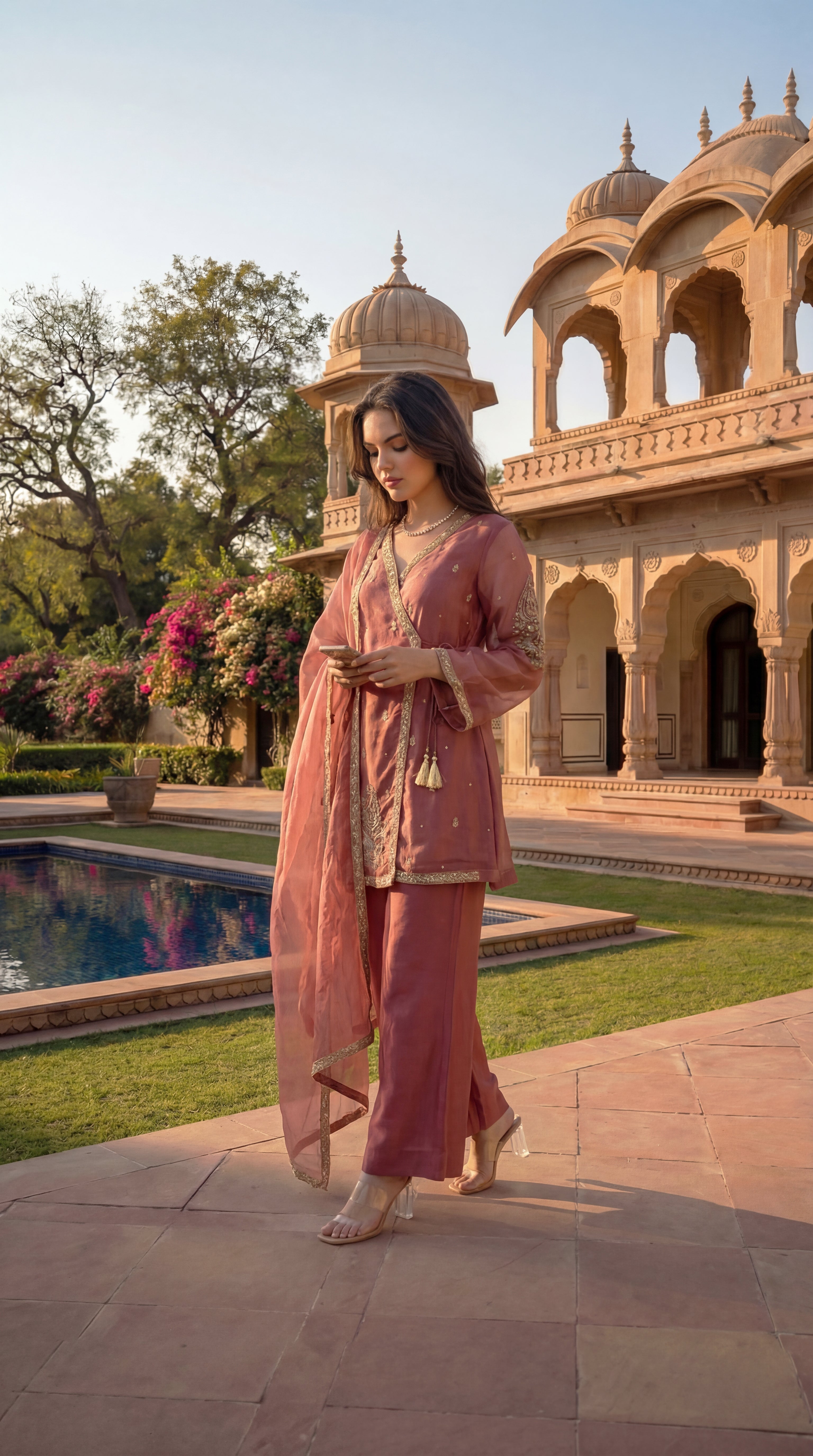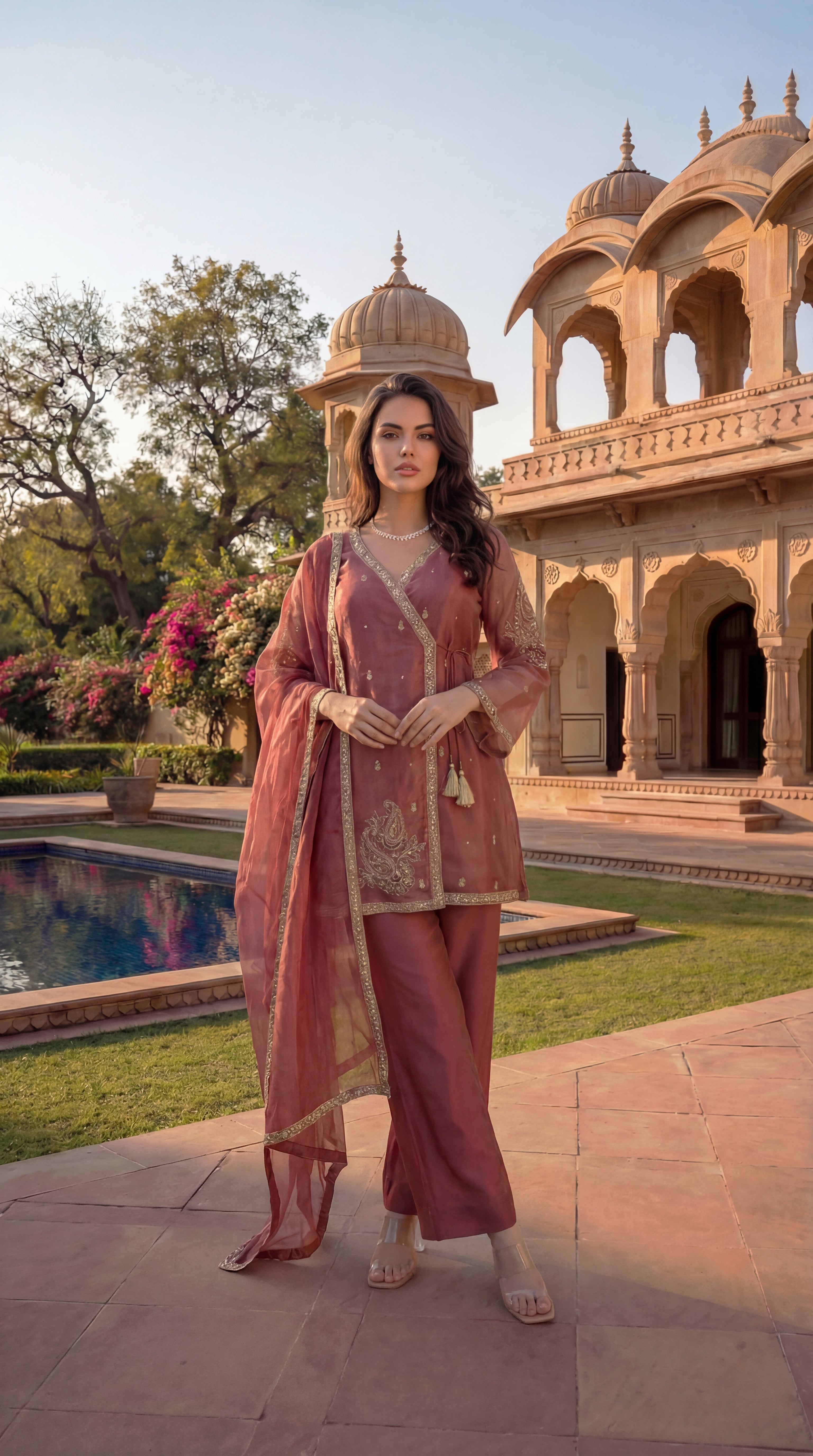 Paired with coordinated bottoms for a balanced silhouette, the ensemble is completed with a sheer organza dupatta that lends fluidity and elegance—perfect for daytime festivities, intimate celebrations, and elegant occasions.
