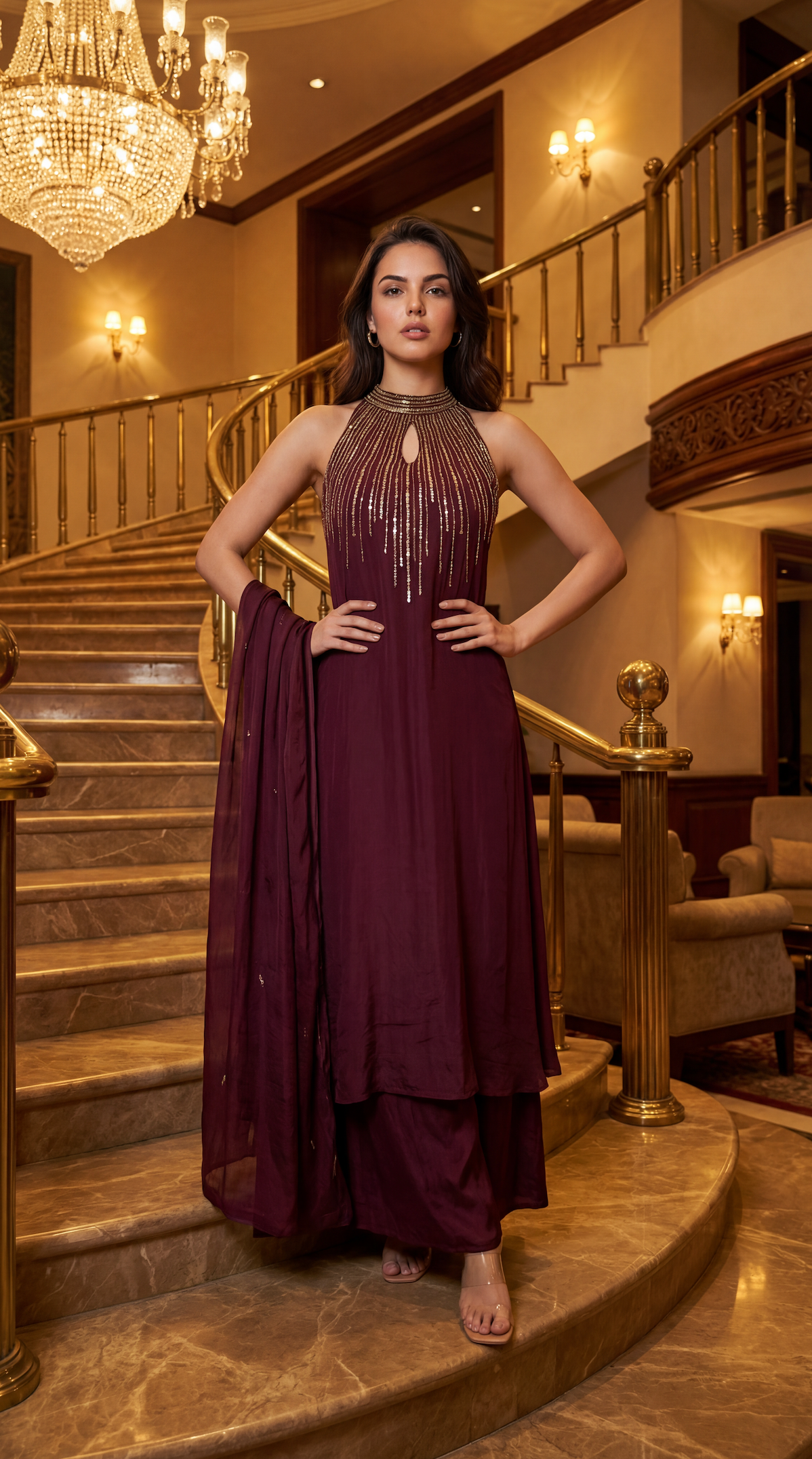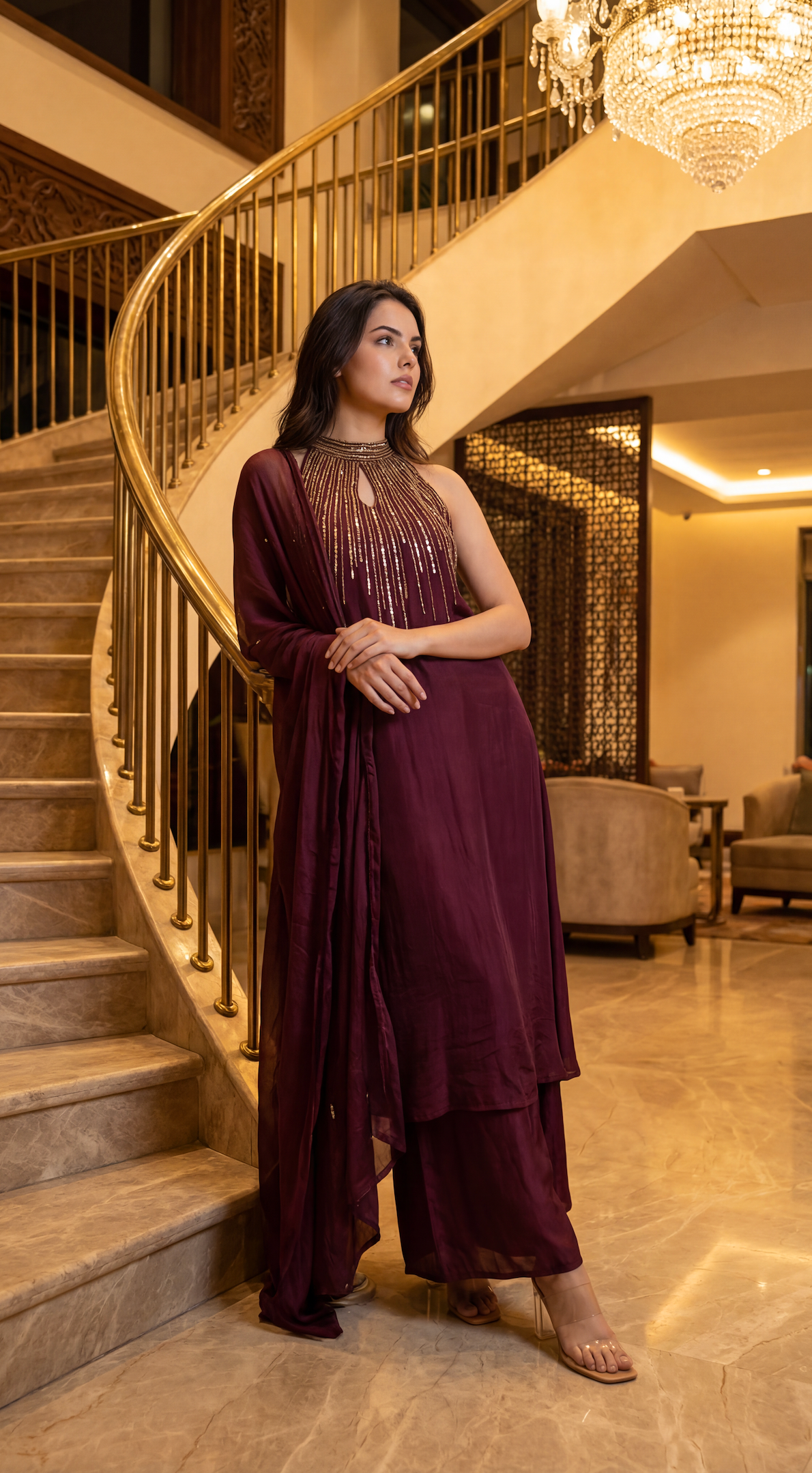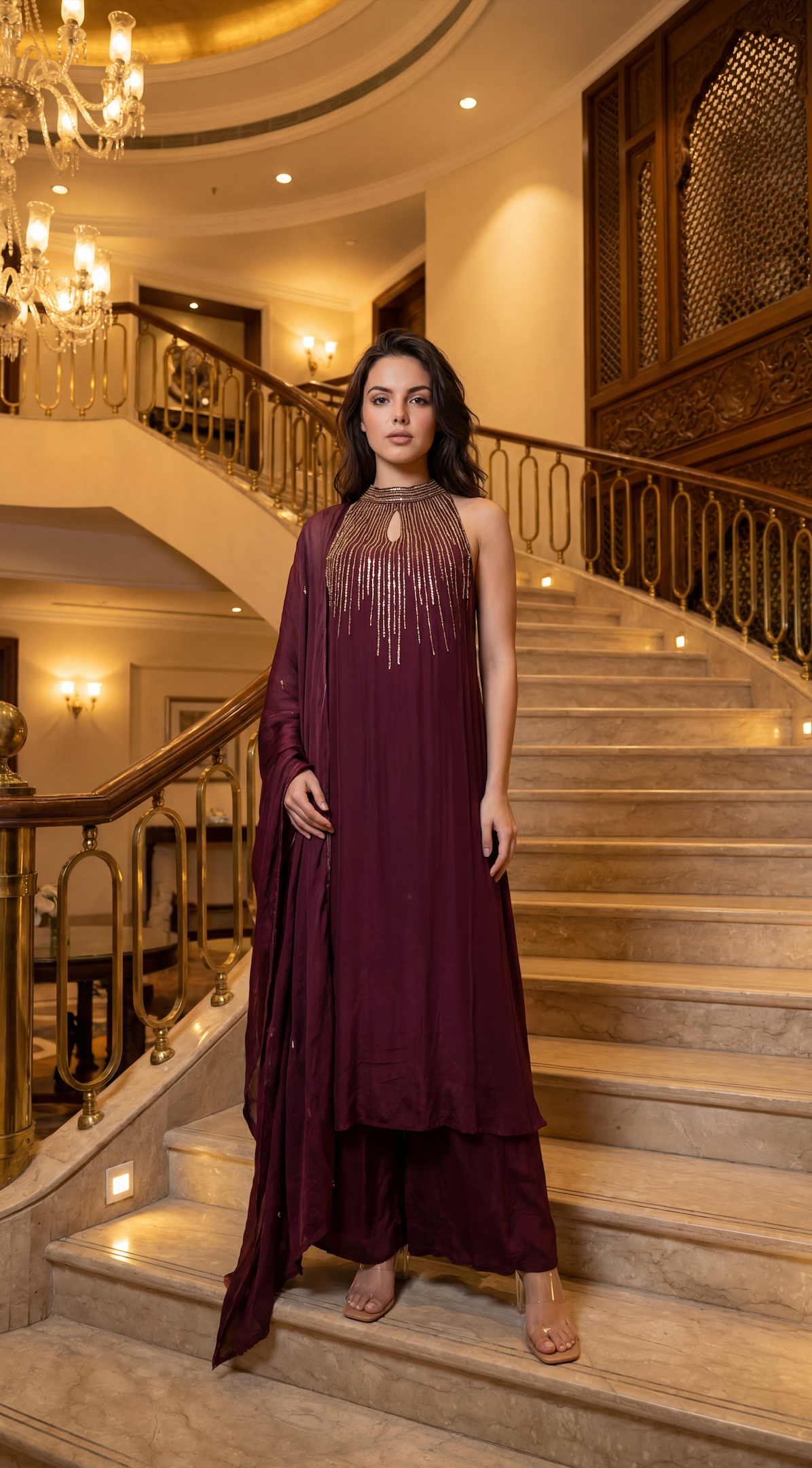 A chic three-piece ensemble crafted in fluid crepe fabric, designed to blend contemporary elegance with festive sophistication. The kurta features a stylish halter-neck with a keyhole neckline, beautifully highlighted with intricate handwork embroidery that adds artisanal charm and refined glamour. The silhouette is clean, modern, and effortlessly flattering.