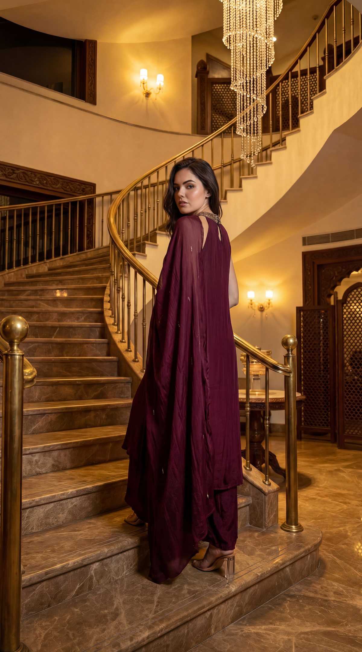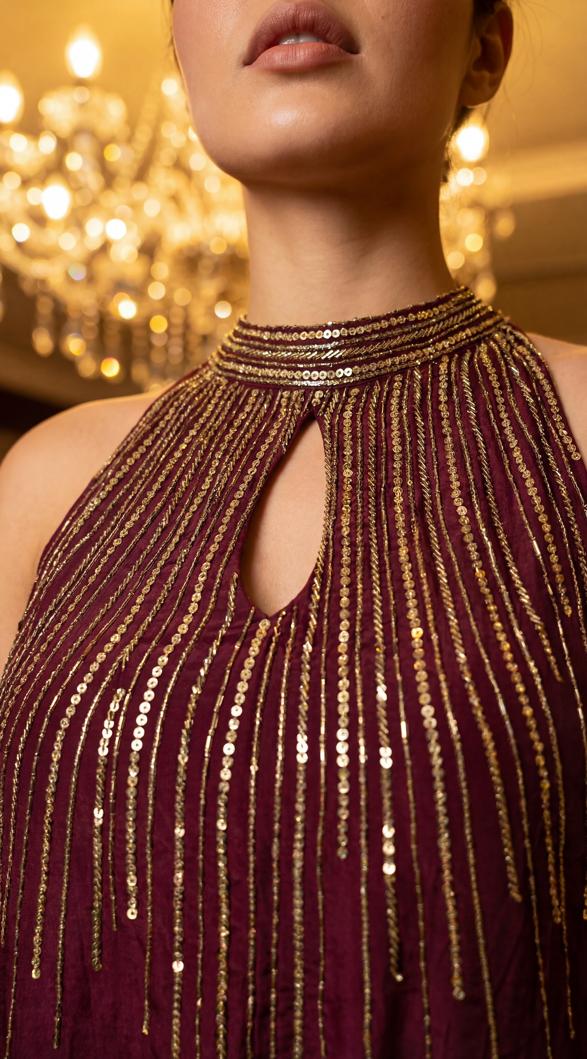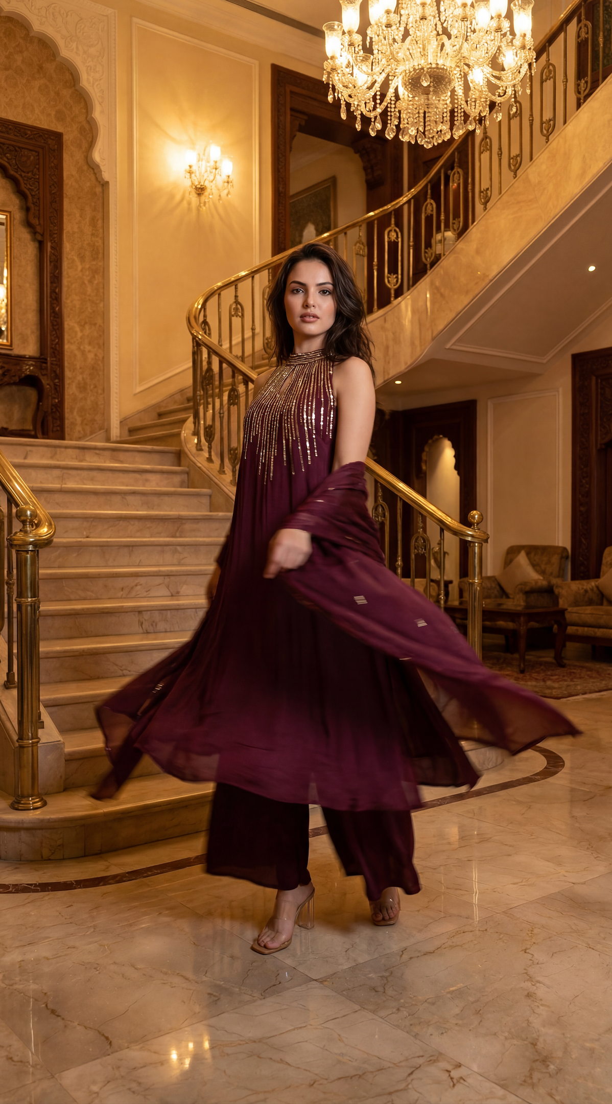 A chic three-piece ensemble crafted in fluid crepe fabric, designed to blend contemporary elegance with festive sophistication. The kurta features a stylish halter-neck with a keyhole neckline, beautifully highlighted with intricate handwork embroidery that adds artisanal charm and refined glamour. The silhouette is clean, modern, and effortlessly flattering.