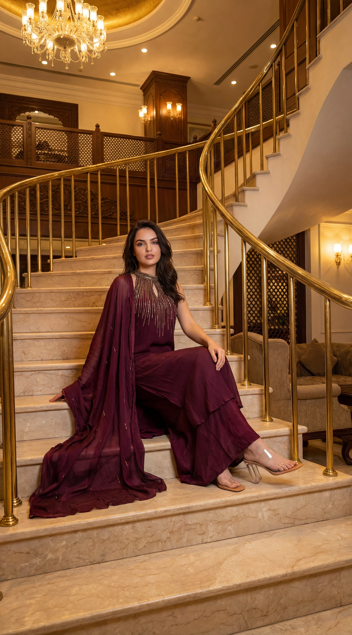 Paired with coordinated bottoms for a sleek finish, the ensemble is completed with a graceful pure organza dupatta that lends lightness and elegance—perfect for cocktail evenings, festive gatherings, and modern celebrations.
